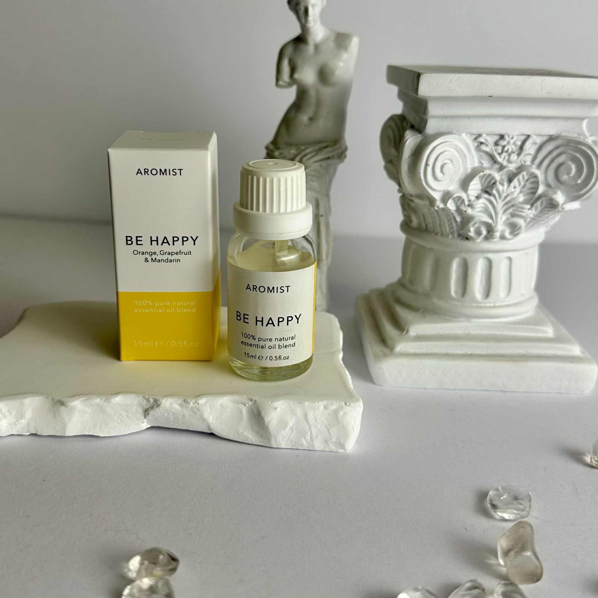 The Aromist "Be Happy" essential oil blend is a 100% pure and natural citrus combination designed to uplift your mood, stimulate positive energy, and encourage inner contentment.