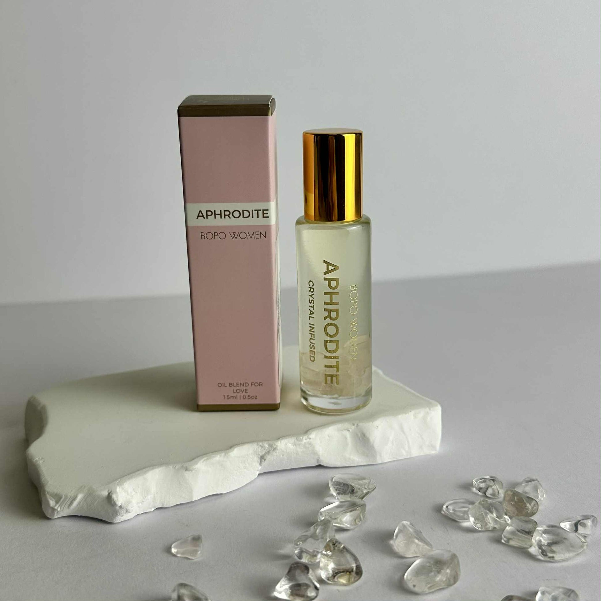 The BOPO WOMEN Aphrodite product is a 100% natural, crystal-infused essential oil blend designed as a light, natural perfume alternative. It is meant to cultivate love and abundance.