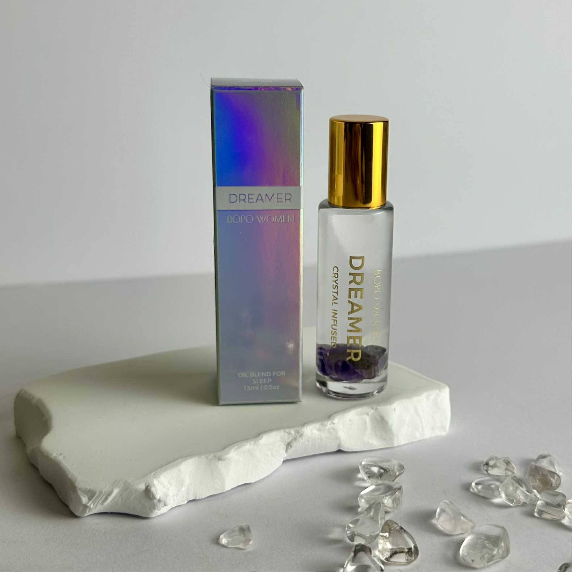 The BOPO WOMEN Dreamer product is a crystal-infused essential oil blend designed to promote a sense of calm, relaxation, and peaceful sleep. It is available as a perfume roller and an essential oil blend for diffusers.