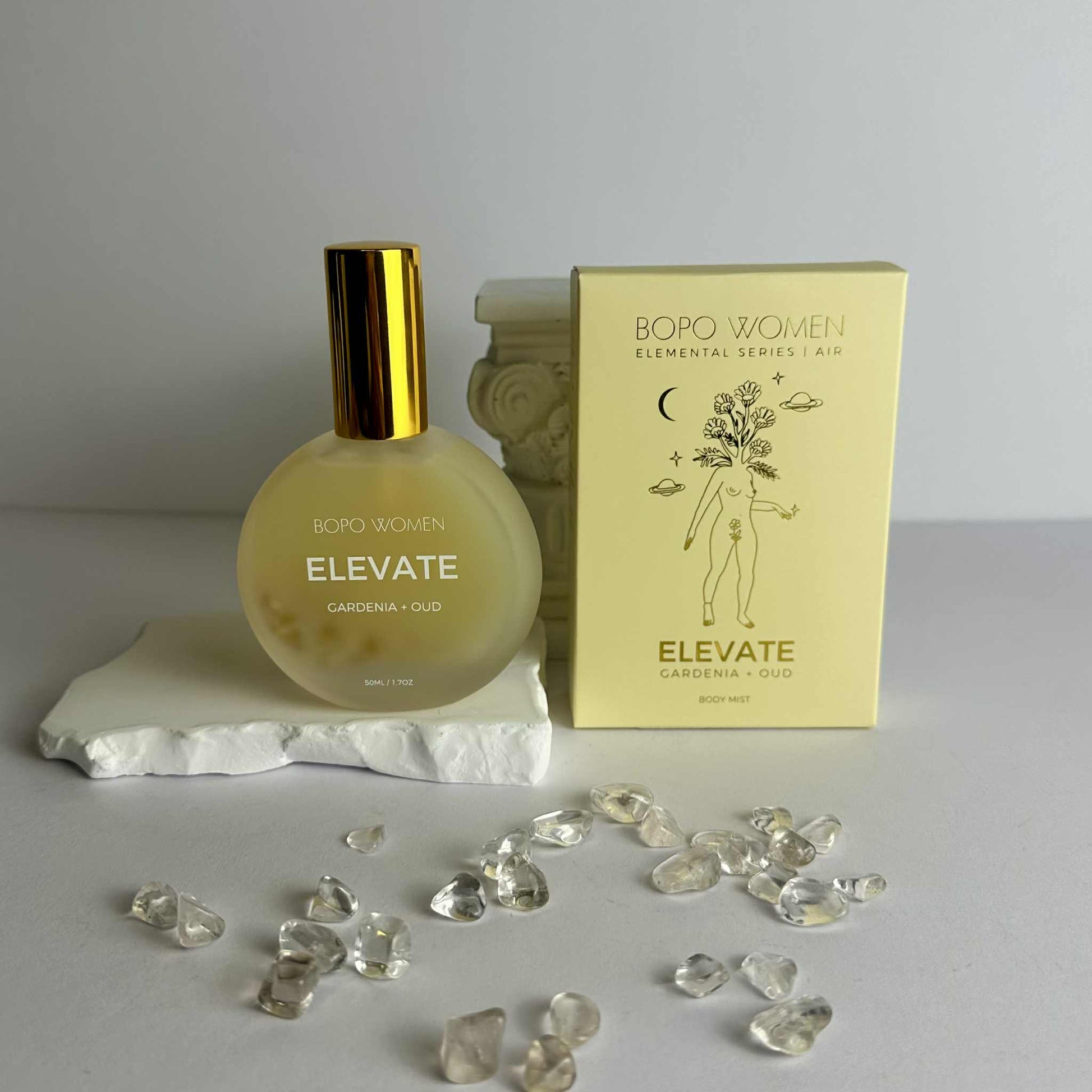 The BOPO WOMEN "Elevate" body mist is a 100% natural, crystal-infused fragrance designed to be an alternative to traditional perfumes. It is part of the brand's Elemental Body Mist range, with "Elevate" representing the air element and inspired by airy, carefree summer days.