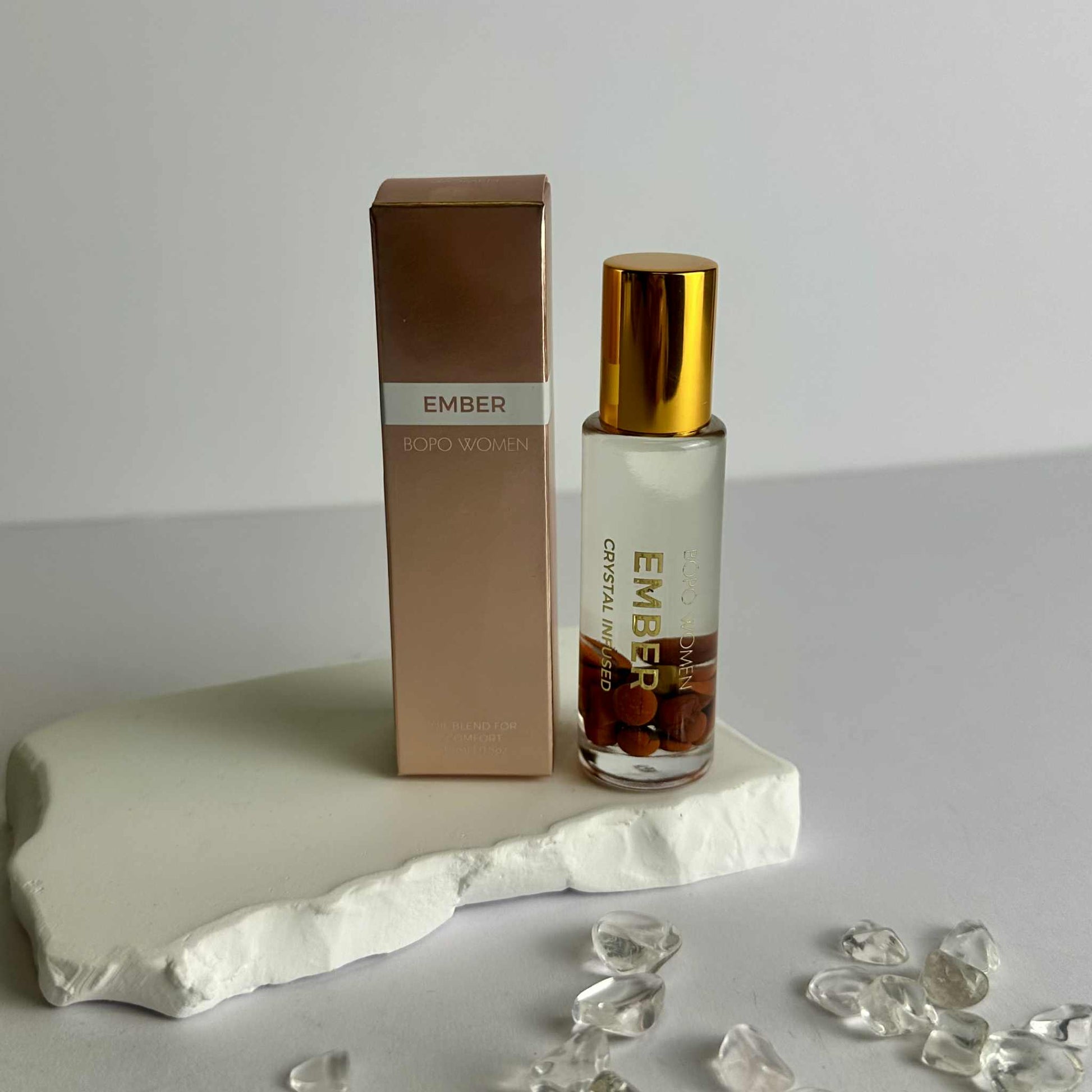 The BOPO WOMEN Ember Crystal Perfume Roller is a crystal-infused essential oil blend designed as a natural perfume alternative. The blend is meant to promote wellbeing and healing through its uplifting and comforting spicy citrus scent.