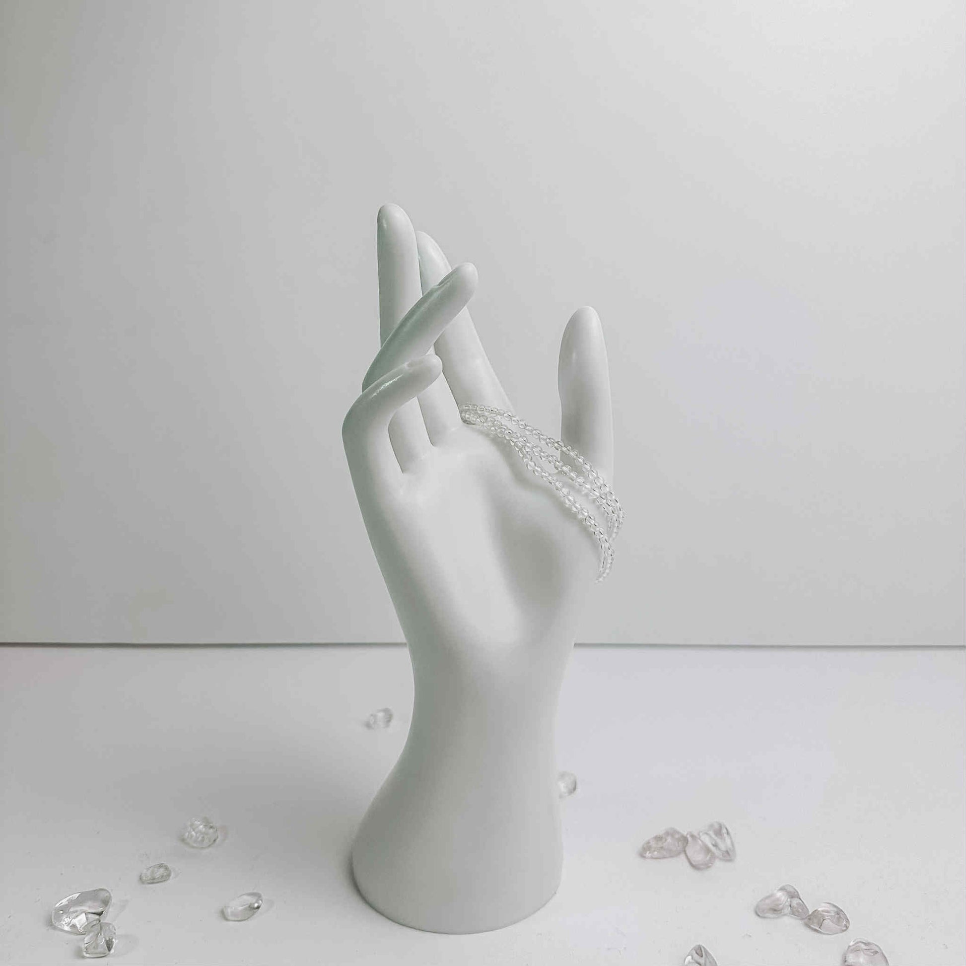 A clear quartz bracelet signifies healing, clarity, energy amplification, and spiritual growth; the "master healer" is believed to cleanse negative energy, balance chakras, and amplify the intention of other crystals. People use clear quartz to enhance concentration, unlock memory, promote inner peace, and manifest goals.