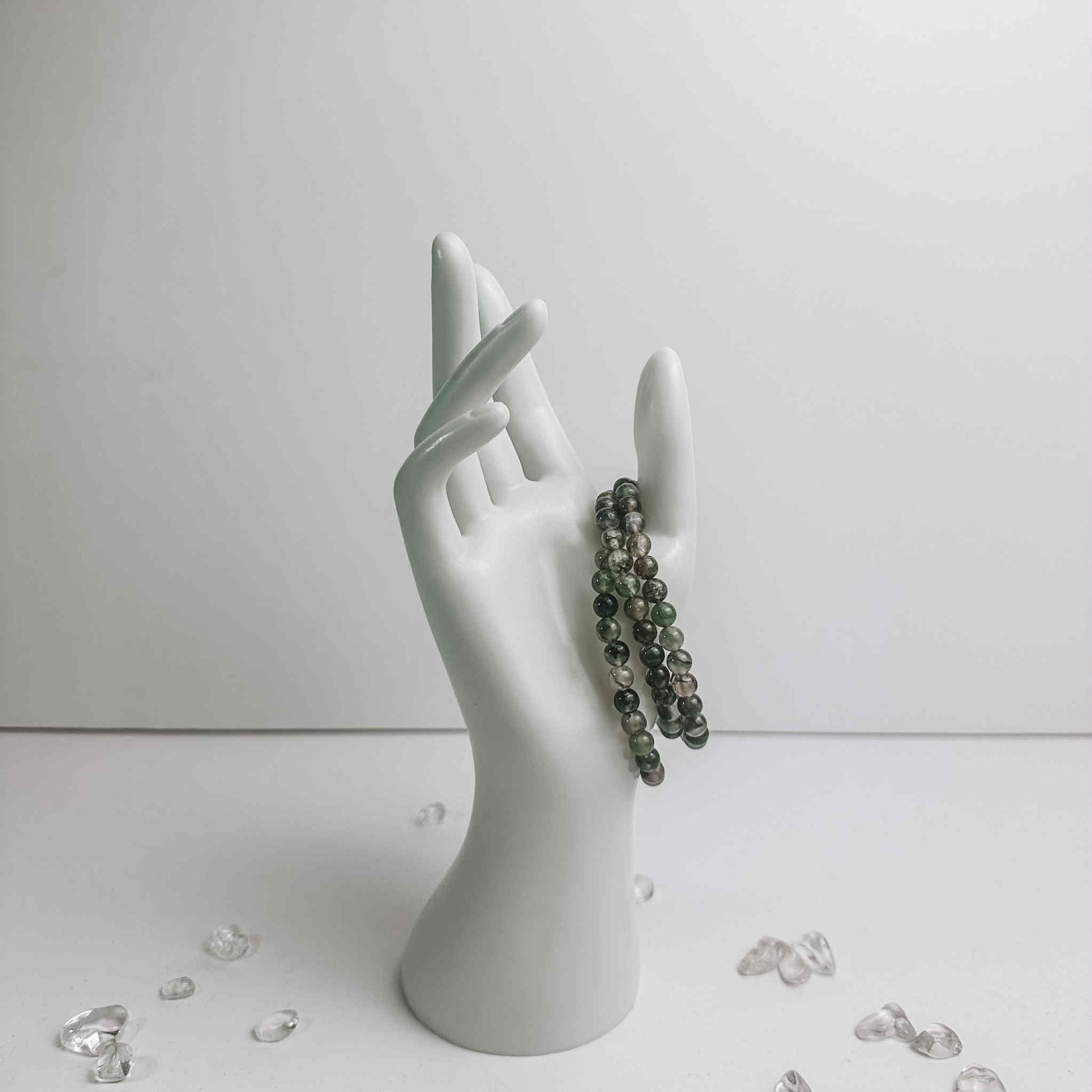 Moss Agate bracelets are believed to symbolize new beginnings, growth, and emotional balance, making them a popular choice for those seeking a fresh start or a deeper connection with nature. They are also associated with attracting abundance and prosperity, and are thought to have grounding and protective properties that can soothe emotions and bring stability.
