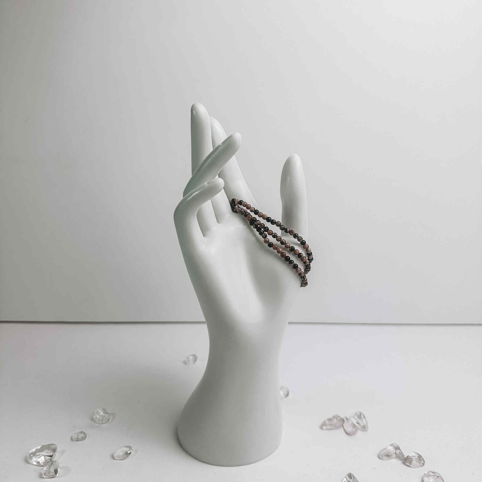 A black-veined rhodonite bracelet symbolizes emotional resilience and grounding, helping to balance the heart with the mind. The pink stone represents love and compassion, while the black veins are thought to provide protection and help release negative emotions.
