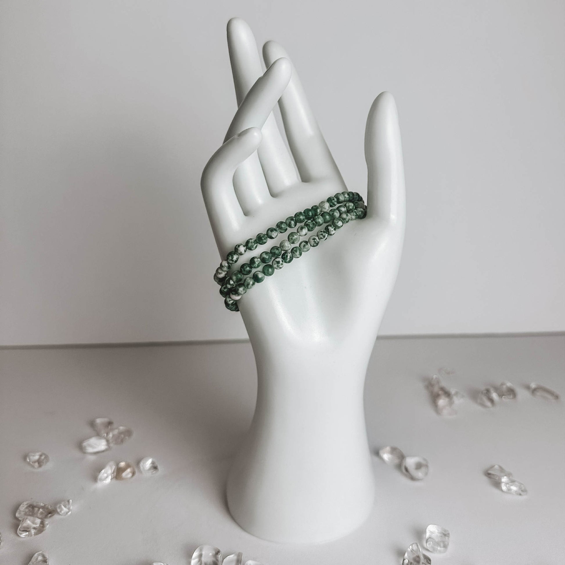 A tree agate bracelet features the distinctive green and white patterned stone known as tree agate, a variety of chalcedony with dendritic (fern-like) inclusions. It is prized for its earthy appearance, which is believed to bring a sense of peace, stability, and a deep connection to nature.