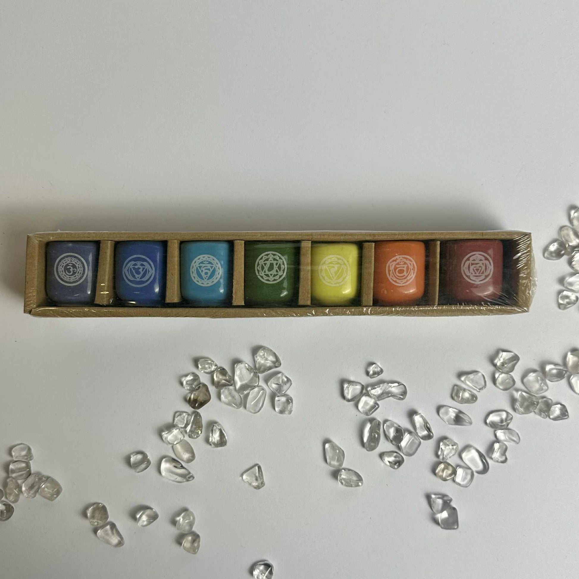 Chakra ceramic candle holders are typically sold in sets of seven, each a different colour representing one of the seven chakras, and are designed to hold chime candles for spiritual or meditative practices.