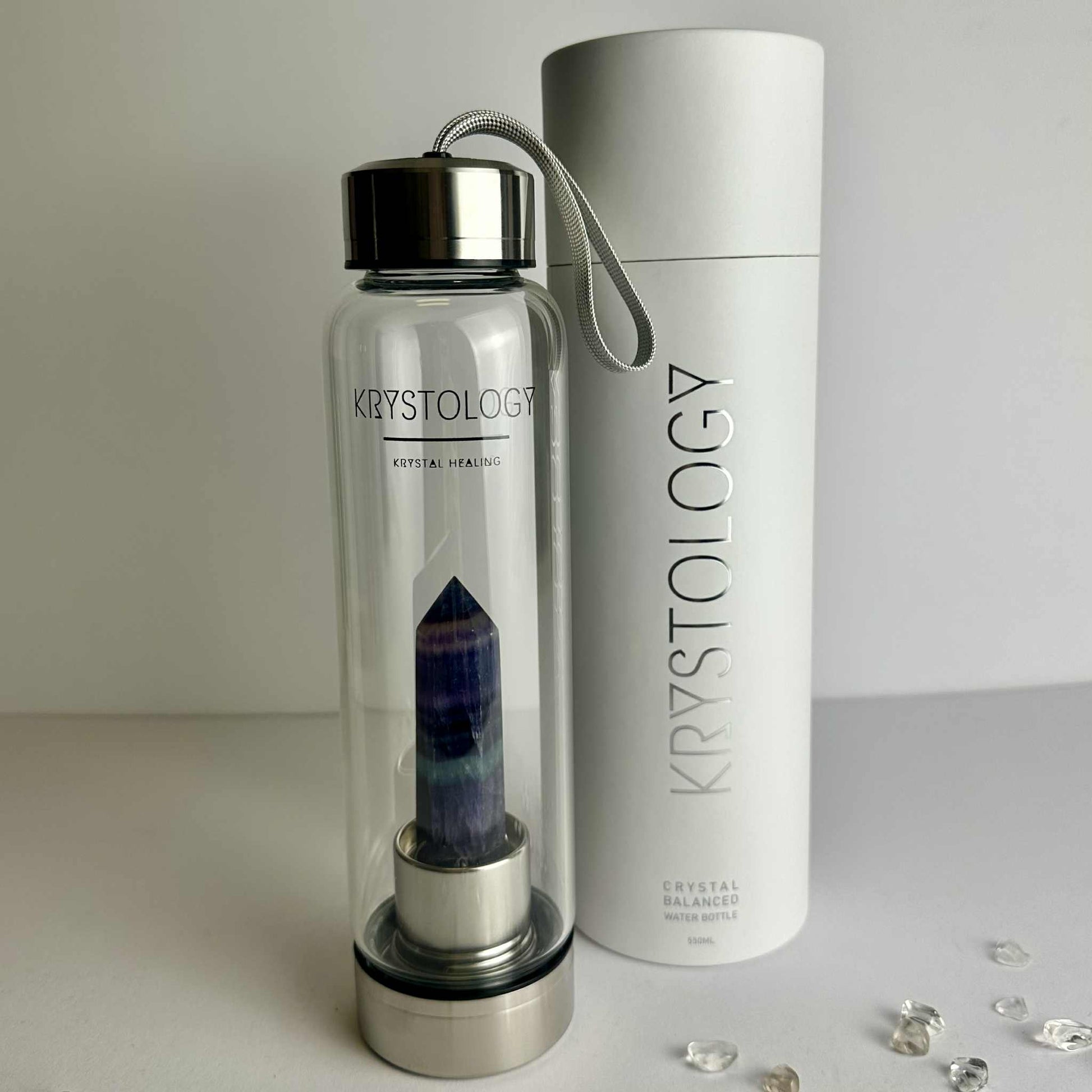 A Krystology Rainbow Fluorite Crystal Drink Bottle is a reusable water bottle designed to infuse water with the purported energy of rainbow fluorite, a crystal associated with mental clarity, emotional balance, and spiritual growth.