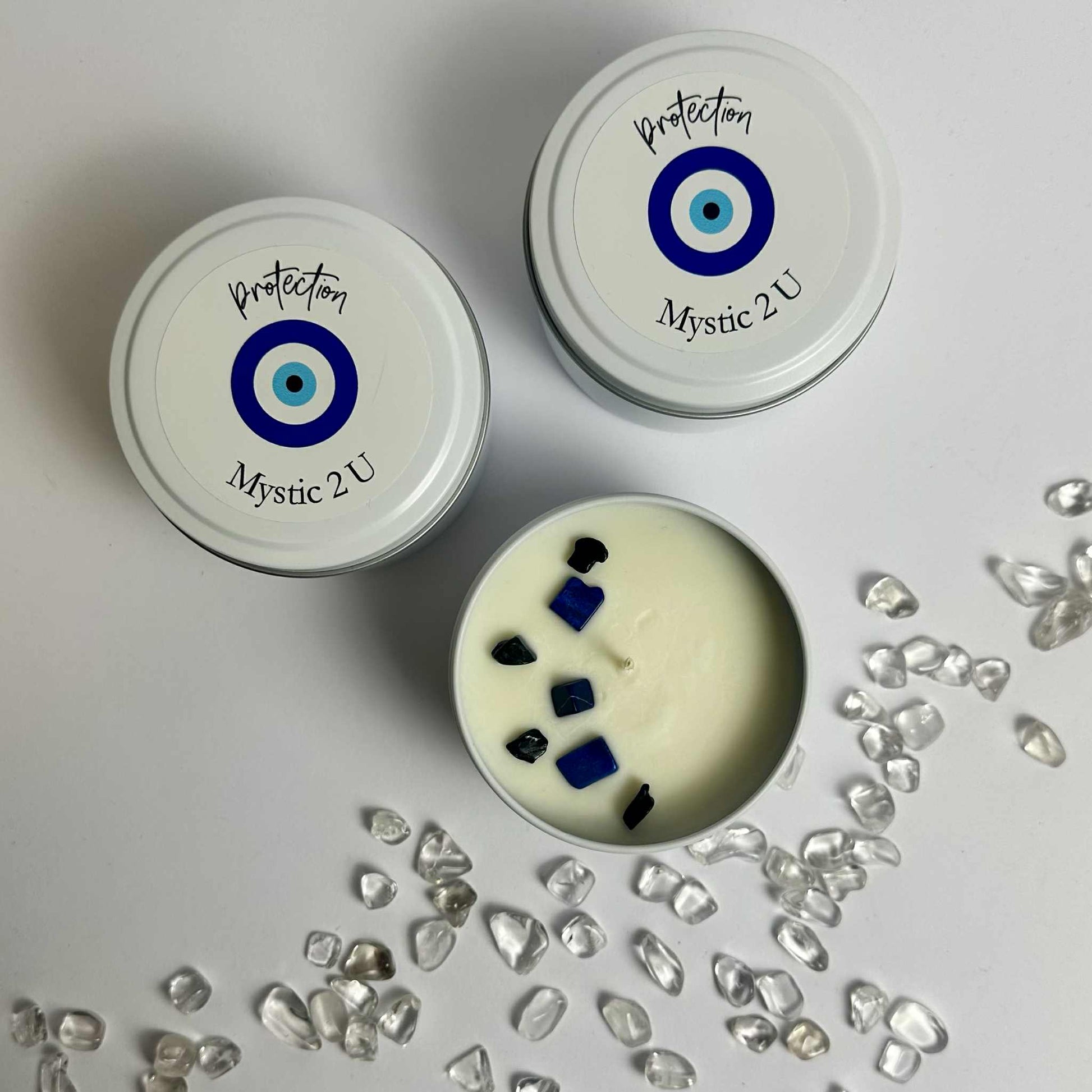 A type of scented candle made with natural soy wax, designed to ward off negative energy and bring good fortune, often incorporating the symbol of the evil eye and natural crystals such as black obsidian for added spiritual protection. These candles are hand-poured, come in various sizes and scents like lavender, and are intended to create a calming atmosphere while providing a clean, eco-friendly burn for longer periods.