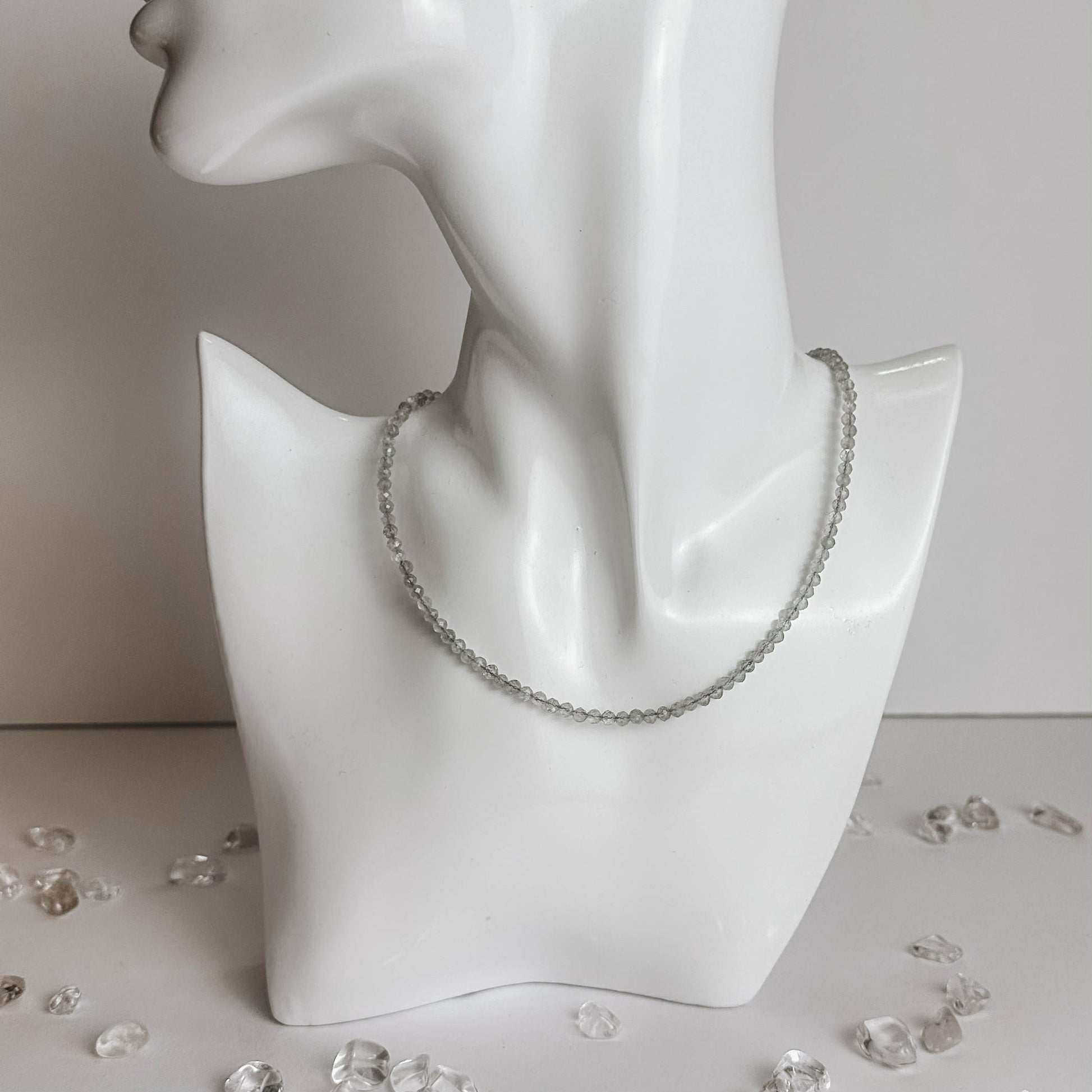 A faceted labradorite necklace features a labradorite gemstone that has been cut to reflect light, creating a shimmering, iridescent "labradorescence" effect with colors like blue, gold, green, and red. Prized for their protective and transformative qualities, said to awaken intuition, strengthen spiritual awareness, and ward off negative energies.