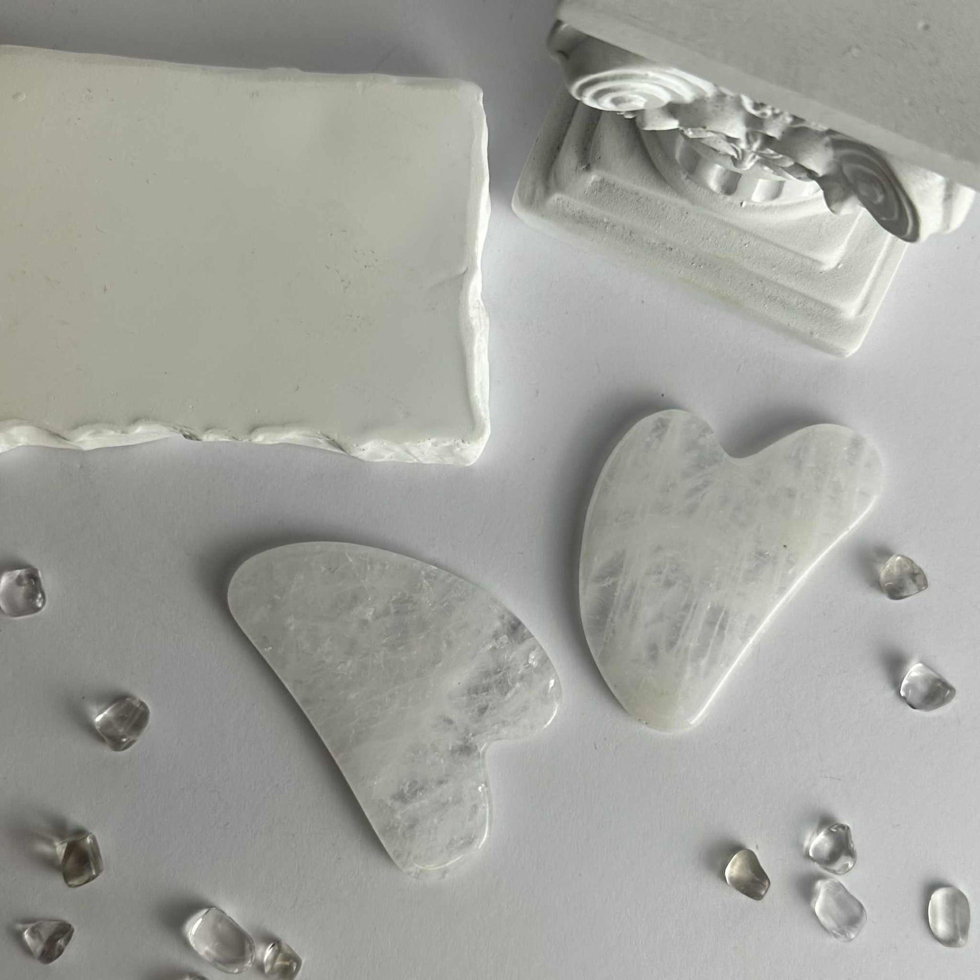 A clear quartz gua sha is a facial massage tool used in traditional Chinese medicine, hand-carved from clear quartz crystal. This practice is believed to improve the health and appearance of the skin while providing the added metaphysical benefits of the clear quartz crystal.