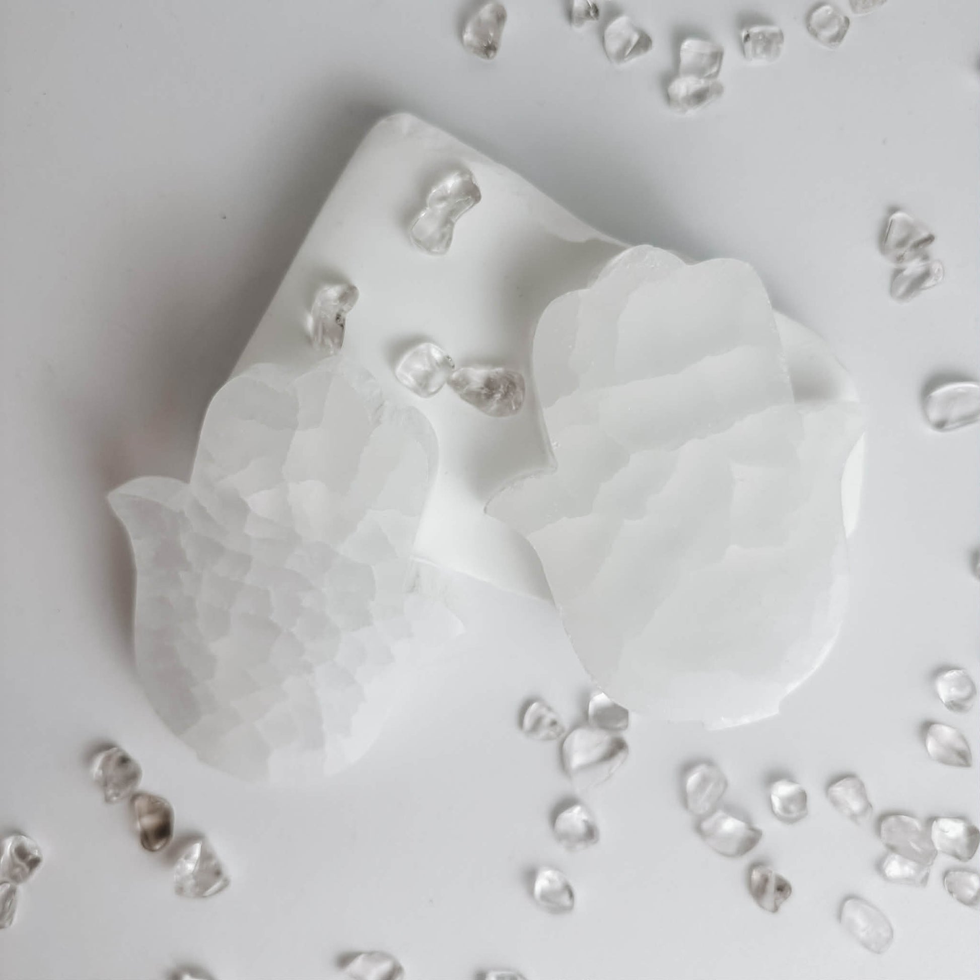 A selenite hamsa charging plate combines the selenite crystal's cleansing and clarity properties with the hamsa hand's protective symbolism. It's used to cleanse and charge other crystals or jewelry, while the hamsa design provides a visual representation of protection against negative energy.