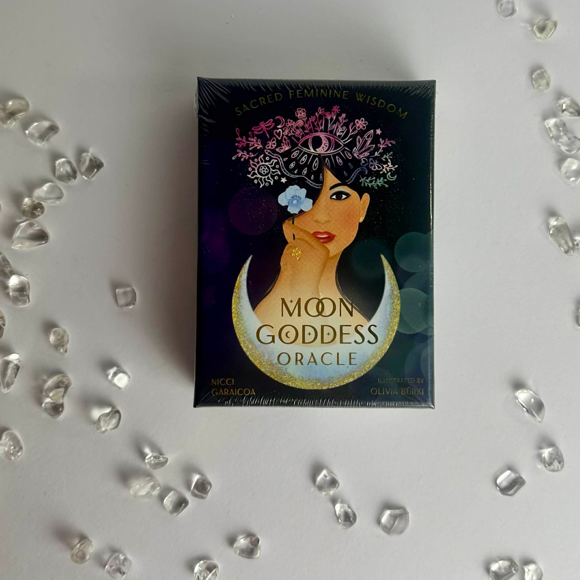 The Moon Goddess Oracle: Sacred Feminine Wisdom is a 36-card deck and guidebook created by author Nicci Garaicoa and illustrated by Olivia Bürki. It is a tool for connecting with the divine feminine, the cycles of the moon, and the wisdom of goddesses to inspire and guide your life.