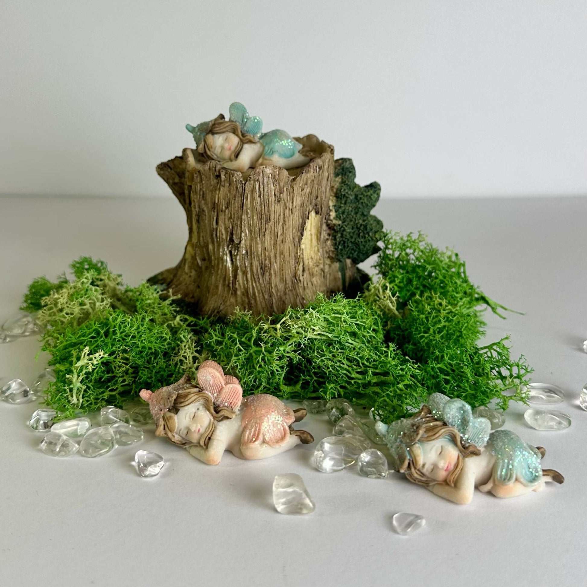 A miniature sleeping fairy is a whimsical garden accessory that adds a touch of magic, serenity, and tranquillity to any fairy garden, terrarium, or potted plant. These small figurines depict fairies in various states of slumber, often nestled on leaves, rocks, or flowers, and are crafted with intricate detail.