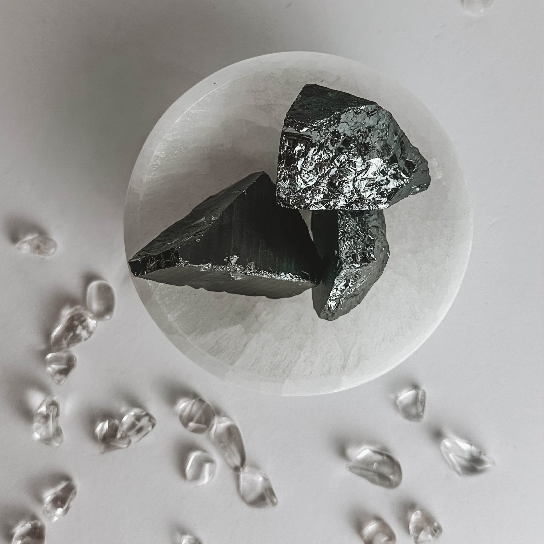 Terahertz is not a naturally occurring stone but a man-made material. It was first developed in Japan using silica extracted from sand or quartz for high-tech applications, including medical technology. In the wellness and metaphysical communities, it is valued for its metallic appearance and high-frequency vibrational energy.