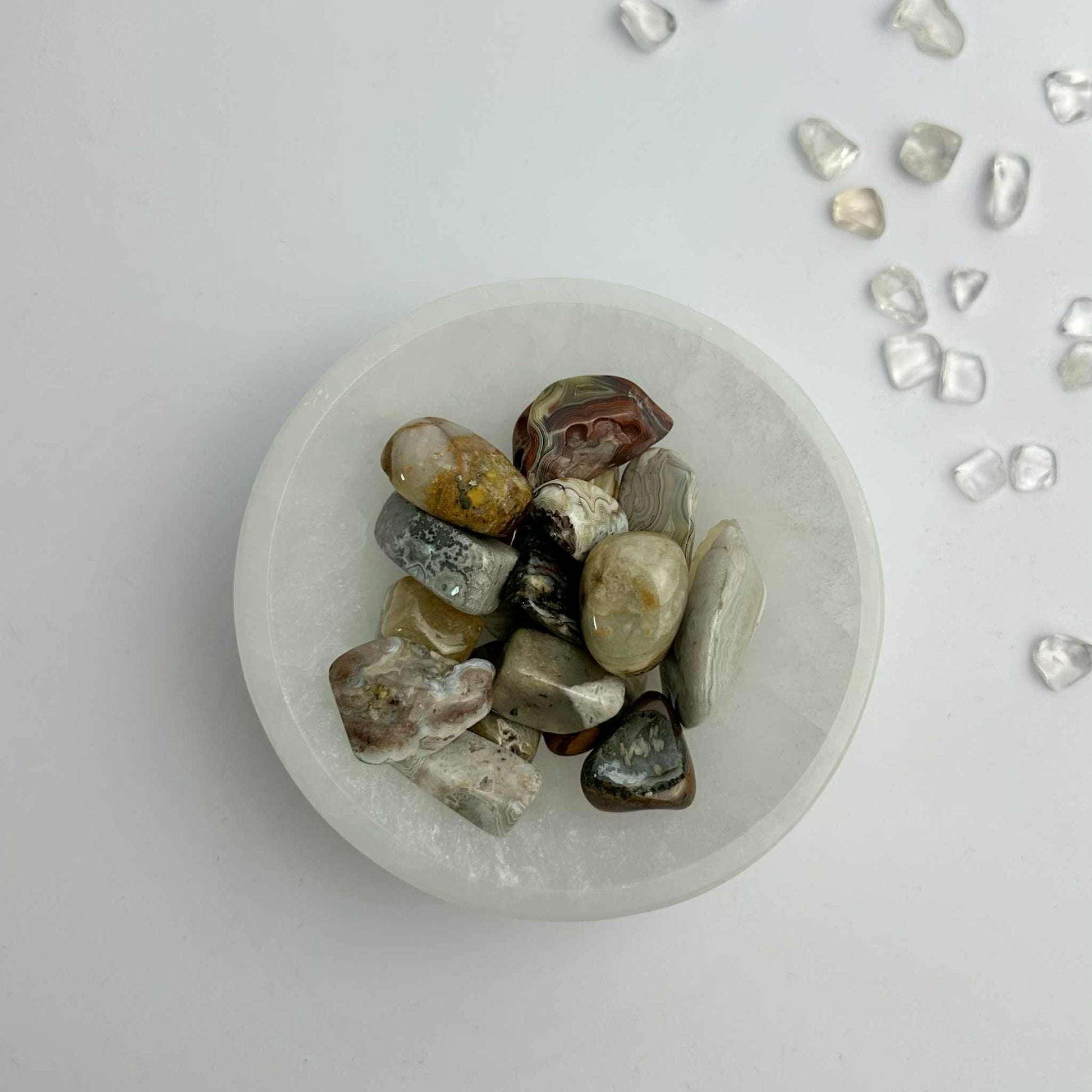 Crazy Lace Agate, also known as "Laughter Stone," is a tumbled stone associated with joy, laughter, and optimism, encouraging a positive outlook and balancing emotional, physical, and intellectual bodies. It is believed to boost energy levels, stimulate creativity, aid in decision-making, and provide a sense of vitality and stamina. This grounding and protective stone helps to release emotional pain, promote spiritual awareness, and support the body's vitality and balance.