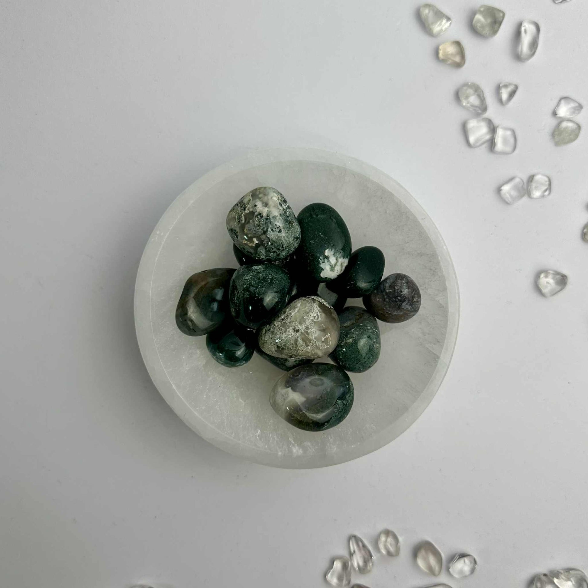 Moss agate is a grounding and nurturing crystal associated with new beginnings, abundance, and emotional healing. Its earthy greens and garden-like inclusions connect it to nature and the Devic Kingdom, promoting growth and prosperity while fostering self-esteem and emotional balance.